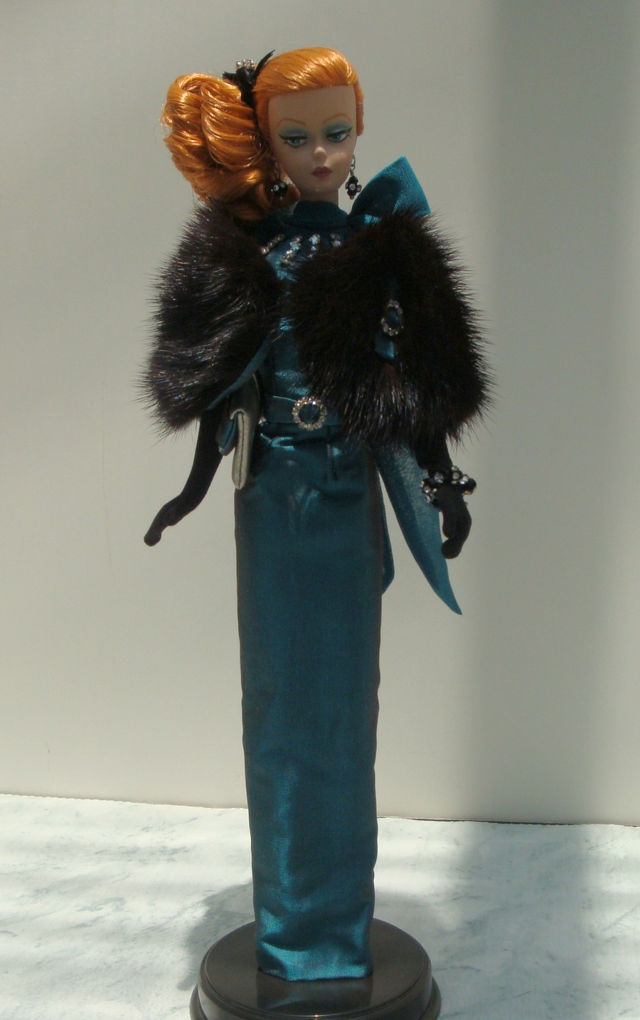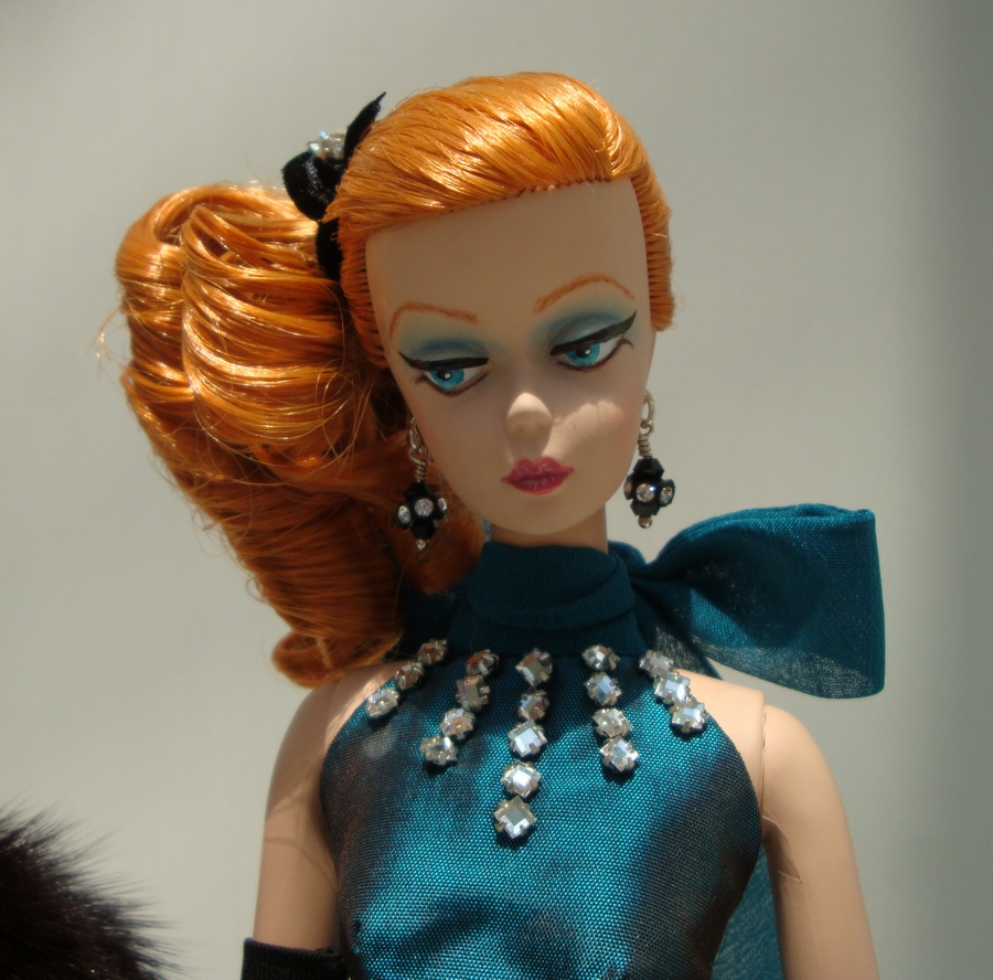 “Clair de Lune”, a OOAK silkstone Barbie® doll, formerly “Continental Holiday Barbie”, has had a complete makeover. This includes full facial repaint, mani/pedicure, and restyled hair. Her one of a kind gown is cut from silk jacquard in smoky silver commemorating the 25th anniversary of this convention. Her bodice and train are from imported silk lace and hand beaded with hundreds of delica beads and micro sequins. Auction doll includes rose pink gloves, an evening bag in rose pink with a beaded lace overlay and crystal/silver-tone hair accents. She will also have a COA and include the mirror base, “MAD” stand and “moon over ocean” backdrop.